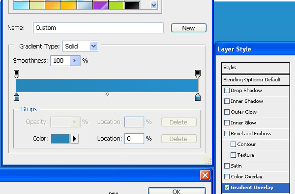 创建一个新层画一个400px高的长方形. 这是用作我们网页页头的. 给它设置一个线性渐变,由颜色 #2787b7 to #258fcd.