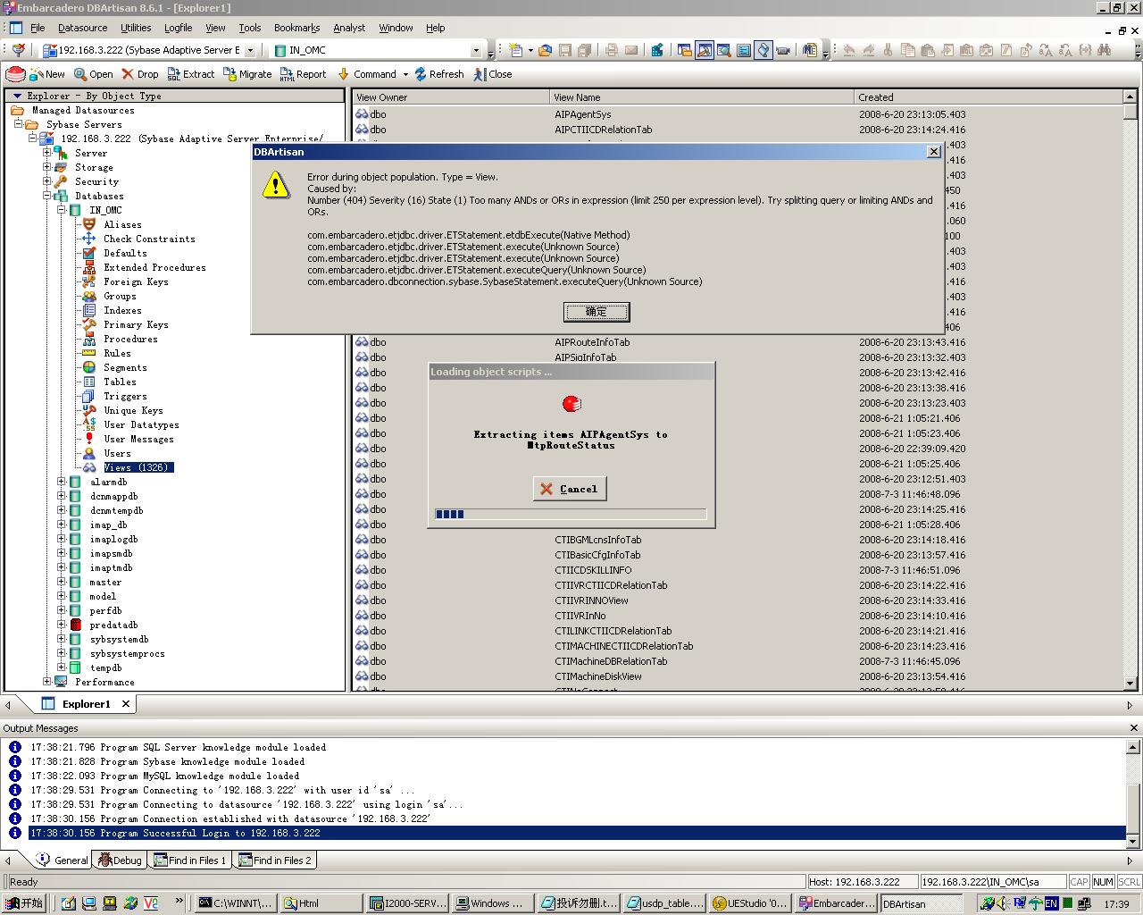 sybase是12.0的,DBArtisan是8.6的,使用Extraction Wizard导出整库表结构,或者在库中查看table,使用全选,右键选Extract,都报类似的错误:“Error:Number(404)Serverlty(16)State (1) Too Many ANDs and ORs in expression(limit 250 per expression level). Try spliting query or limiting ANDs and ORs."