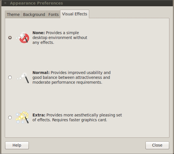 但是悲剧发生了,今天我去试了一试系统自带的特效就是点了第一章图第三个,然后试了一下之后发现没有特效,然后我就选择第一个none把系统自带的特效关了想使用compizcofig的特效。但是发现回不去了。界面依然还在。