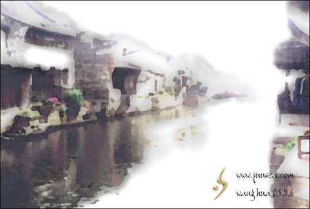 8.最后还可以用魔棒工具点选图案中的任意一处颜色,然后到菜单-选择-选取相似的,再作一下羽化处理,然后用CTRL+M将被选中的部分的色泽调暗一点,也可以用CTRL+U调节一下色象跟饱和度,其余的不适之处可以自己作细微的调整,看您自己的喜好而定,这就不作说明了,好了,一幅淡彩水墨画就这样完成了。(图9)。
