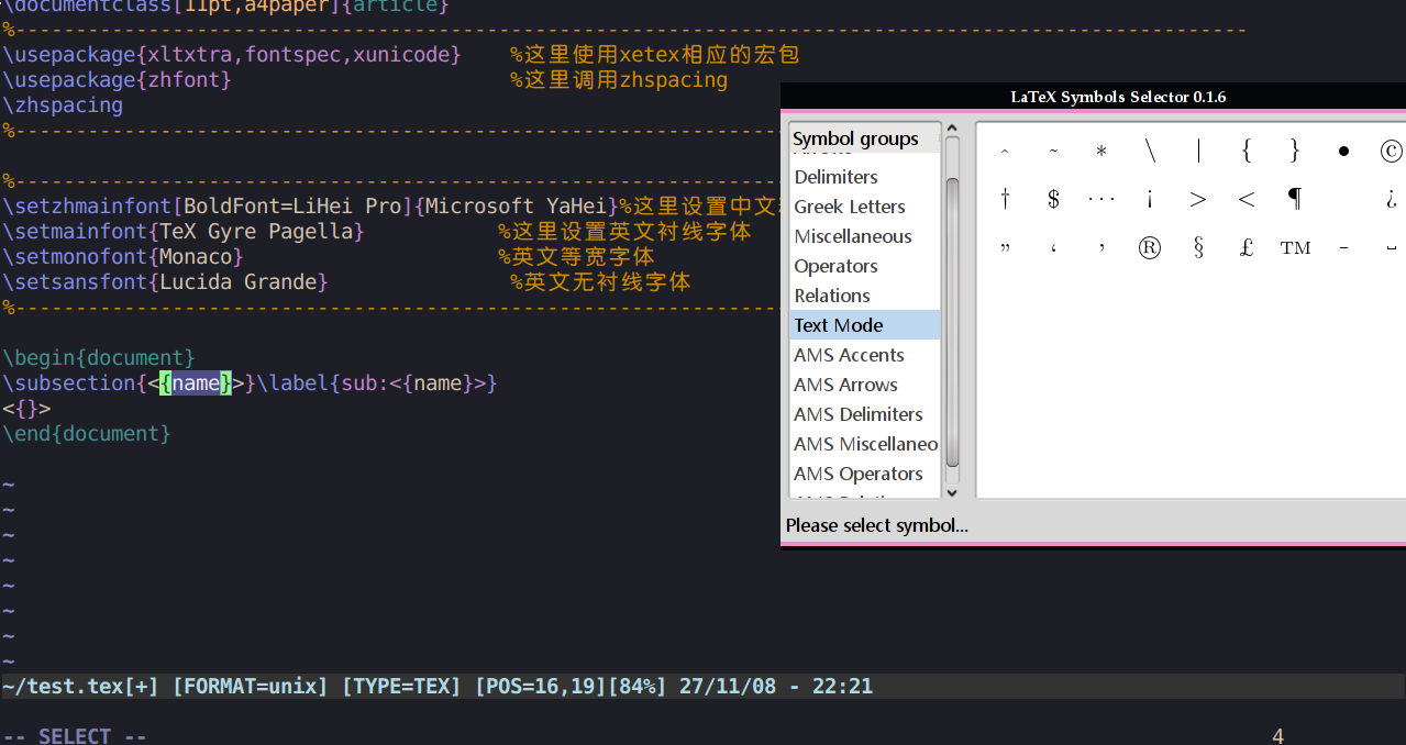 此外latexsuit的操作不符合现在的习惯,比如把全部命令或环境绑定到了键盘上,这样你是一个按键组合+写一些内容,之后ctrl+j跳转到下一个需要填的地方。这样子容易和自己的设置或是记忆上困难,所以现在我想合适的方法是用snippet,比如输入lett然后按tab,自动展开,填完第一处,tab到第二处。我现在是使用中慢慢补全自己的片段,加上写了字典,文字翻转的一些扩展才好用些了。加上即使用latexsuite,也要顾及现在未必都是用latex啊,比如可能用xetex之类的,用vim还是自己写配置的话顺手些。呵呵。一切为了自己的习惯。