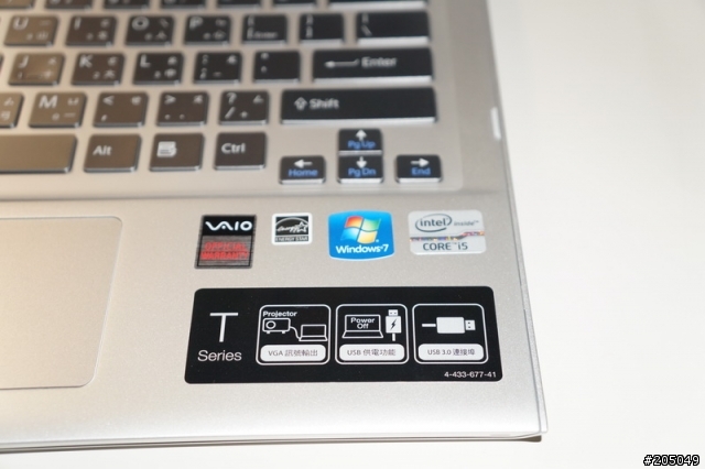 键盘右下处,Windows 7、Core i5、认证及特色介绍贴纸。