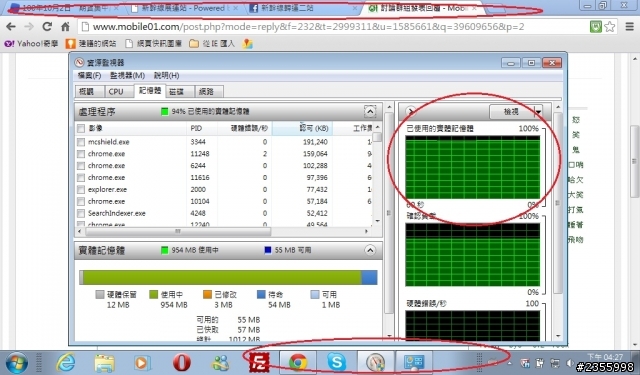 chrome开youtube的时候旁边小徒还跑得出来,但用IE开就跑不出来。不过用到最后,现在chrome也越来越占记忆体,我只开四个网页记忆体居然也能爆。