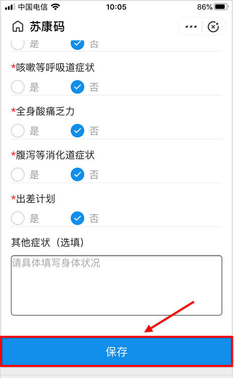6、如实填写健康情况,不要有隐瞒,填写完毕后点击保存。