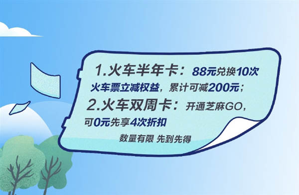 2、火车双周卡:开通芝麻GO,可0元享4次折扣。
