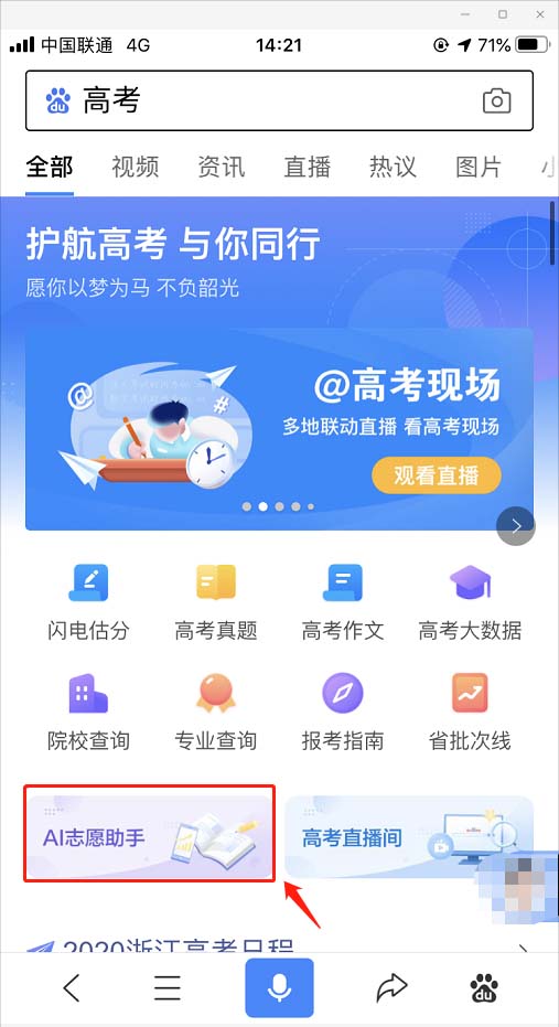 1、进入百度APP,打开百度搜索引擎,搜索百度AI志愿助手。