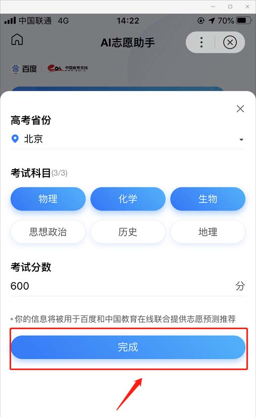 4、选择高考所在地、考试的科目以及预估的高考分数,点击完成按钮。