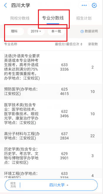 6、专业分数线则是该届招的各专业的最低分,可以进行选择对应时间和科类。