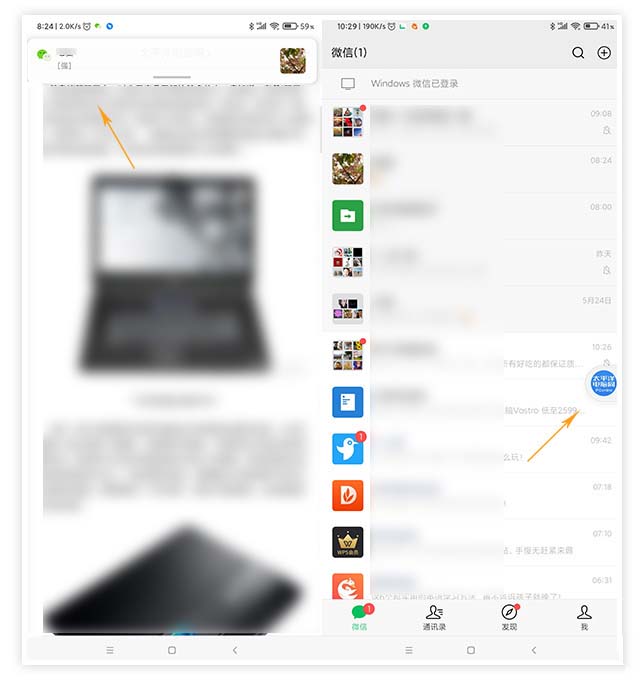 而新版则优化了这一体验,如果你在浏览公众号文章时,新消息依旧会以悬窗方式提醒,当你点击信息后,当前浏览的文章也会自动悬浮到一侧,以方便快速返回。