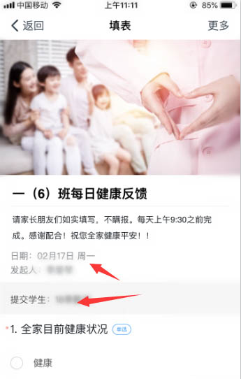 2、进入主程序之后,首页会弹出群管理员设置的健康反馈任务通知,点击查看详情。