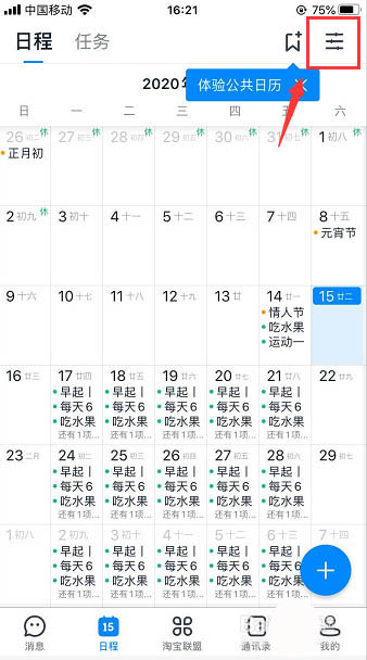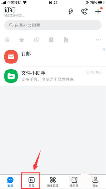 1、打开手机钉钉页面,然后点开 日程,如下图