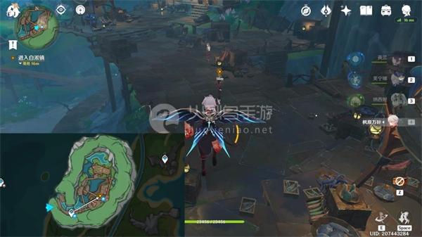 6、需要传送到白淞镇的传送锚点,想着小地图的西北方向进行前进,一直向上爬,前往指引木平台。