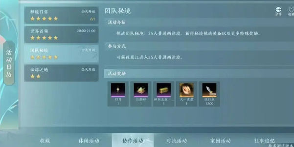 7、如果是PVE玩家,可以看看【协作活动】这一页的部分内容,如【团队秘境】以及【试炼之地】,这两个都是打PVE装备的好地方