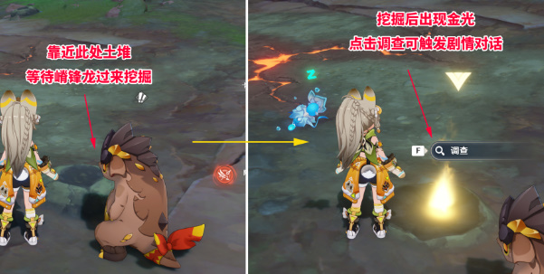 4、玩家靠近土堆这个土龙就会自己挖出来,然后玩家调查一下这个挖出来的东西。