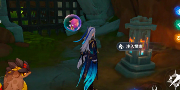 6、进来之后右边墙上有幻写灵解密,幻写灵在石头旁边的笼子里。把石头拉开之后就可以打开笼子。