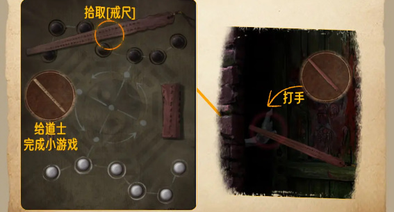 8、来到右边的桥边,上桥对中间的纸使用花钱,使用戒尺打他个措手不及,拿到自己的遗照。