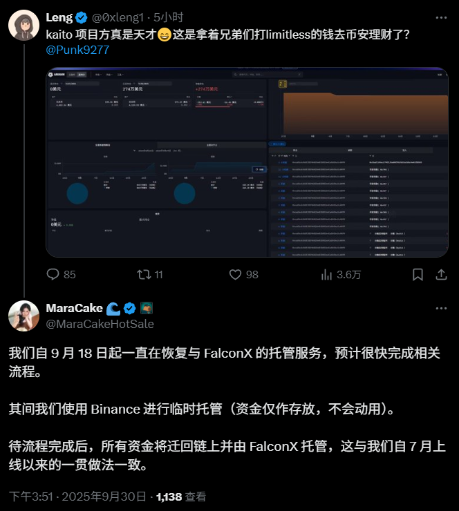 对此,Kaito 相关工作人员回应表示,Kaito 官方自 9 月 18 日起一直在恢复与託管机构 FalconX 的合作,但在此期间,其将暂时使用币安託管资金,不过仅仅作为存放,并不会挪用。该工作人员表示,流程完成后,资金将全部迁回链上并由 FalconX 託管,且符合其自 2025 年 7 月上线以来的惯例。