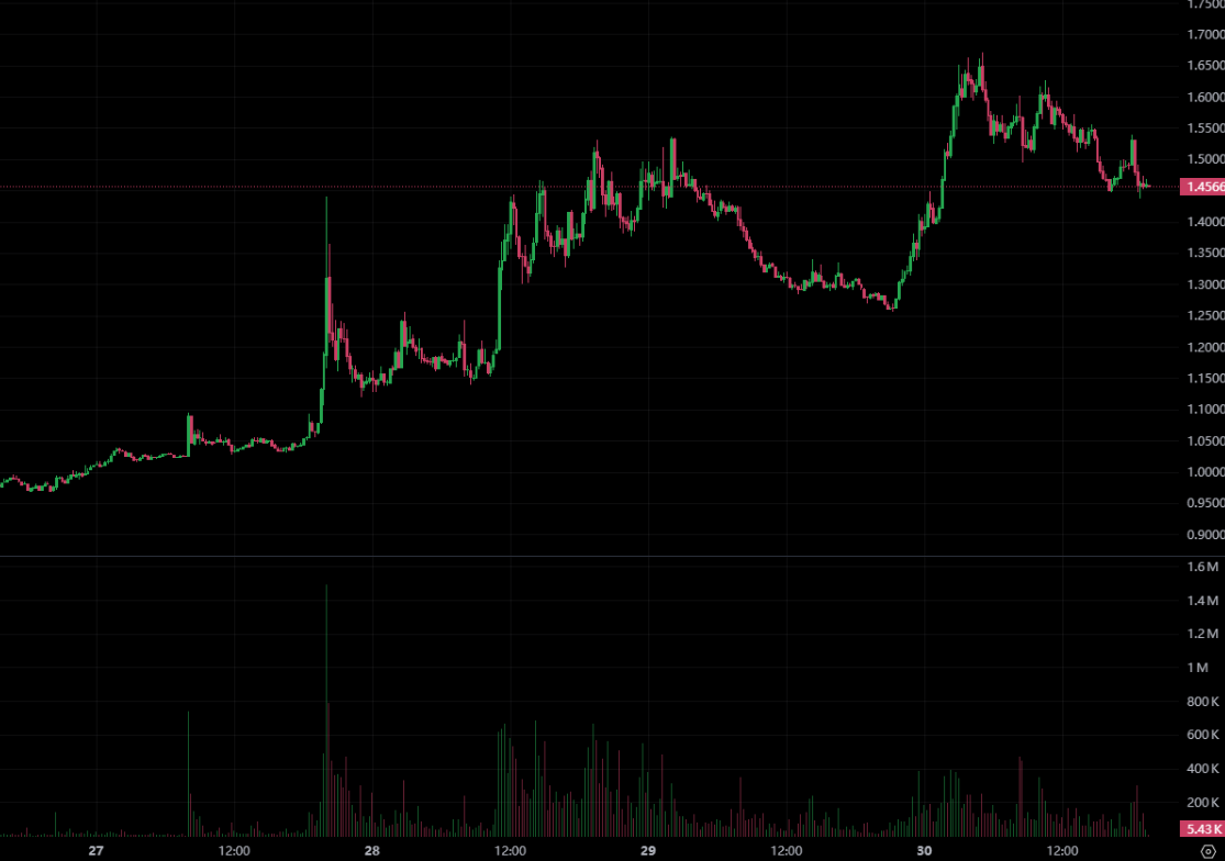 KAITO 币价在近期表现较为强势,自 9 月 27 日开启了一波涨势后,KAITO 币价已经从 1.04 美元附近上涨至撰稿时的 1.45 美元,近 7 日涨幅高达 42%。目前 Kaito AI 是否真的挪用了用户资金,或者如官方所言,只是暂时存放,尚不能确定。但如果社群持续对 Kaito 保持质疑,或许币价也将受到一定压力。