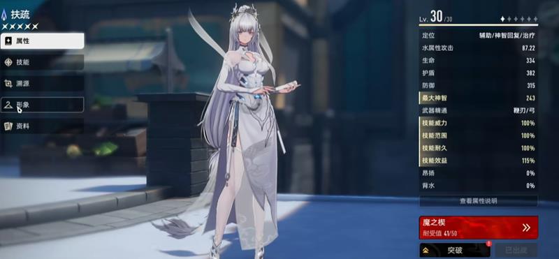 扶疏的核心技能之一是形与神俱,该技能释放时会对自身及周围敌人造成水属性伤害,并为她施加一层超限护盾。这层护盾不仅能吸收一定量的伤害,还能提升自身的攻击速度。值得注意的是,此技能的增益效果并非仅限于自身,周围队友同样可以享受到超限护盾的保护以及部分状态加成。此外,在触发该技能的同时,还会额外赋予队友九针治未的效果,进一步强化队伍整体输出能力,使得扶疏在团战中的作用远不止于单体表现。