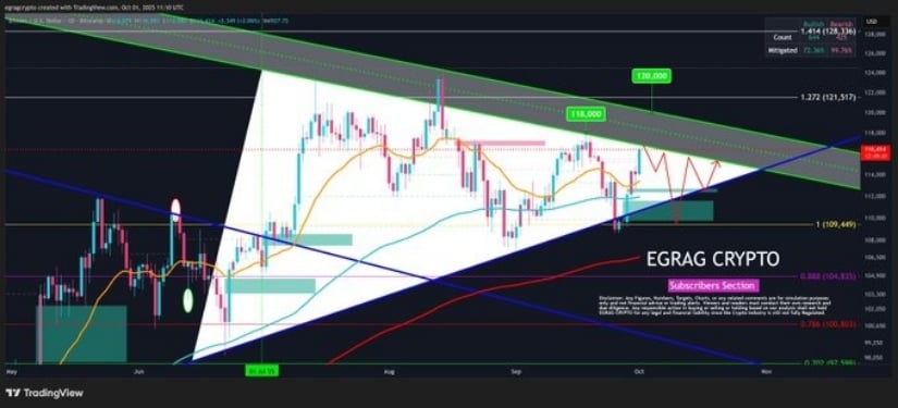 BTC目标突破11.8-12万美元,对称三角形态暗示短期可能出现波动。来源:@egragcrypto via X