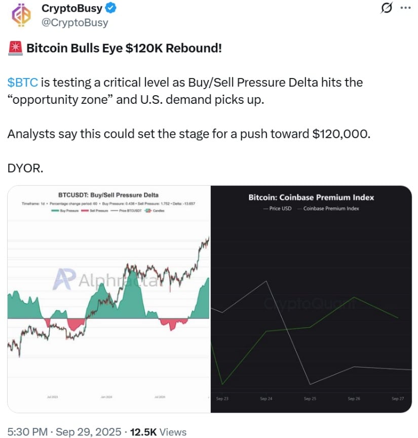 随着买卖压力差进入"机会区间",BTC测试关键水平,或推动价格向12万美元迈进。来源:@CryptoBusy via X
