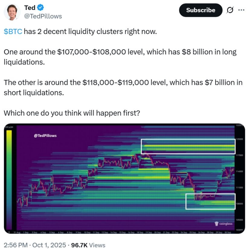 BTC面临两大流动性集群:10.7-10.8万美元(80亿多头)和11.8-11.9万美元(70亿空头)——交易员正观察哪方先被触发。来源:@TedPillows via X