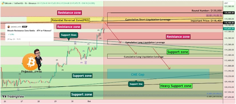 BTC在11.84-12万美元面临关键阻力及潜在反转区,累计多空清算量凸显回调风险与市场张力。来源:pejman_zwin on TradingView