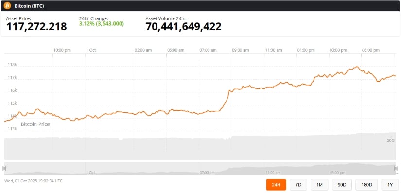 截至撰稿时,比特币价格报117,272美元,24小时上涨3.12%。来源:Brave New Coin比特币价格指数