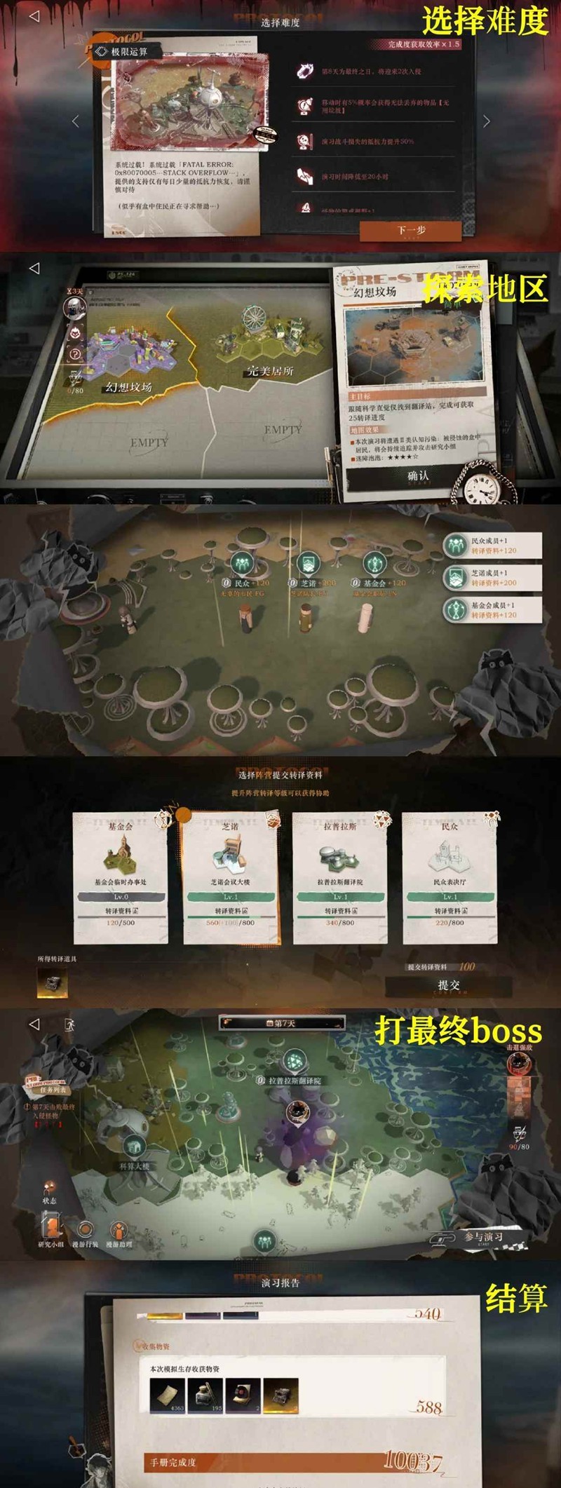选择难度→探索不同地区→招募人员,赚钱,获取转译进度→投票获取不同buff→打最终boss→结算
