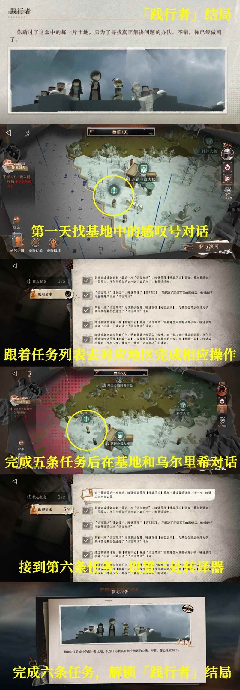 践行者——在探索过程中先完成六条任务列表中的任务,再打完最终boss(图有具体流程)