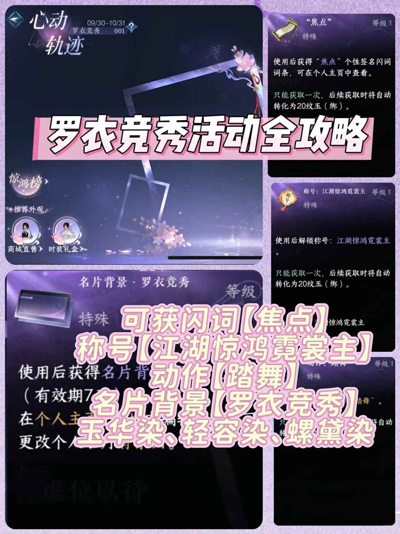 逆水寒全新长期活动【罗衣竞秀】开启,活动时间内在星梦乐园-星光台交互签名板报名,只需参与任意一场完成互动即可拿到限定拍照动作,称号,个性词条,绑玉,玉华染等奖励,周榜结算还将获得限时头衔,限时配饰,小编为你准备了一份攻略,一起来看看吧~