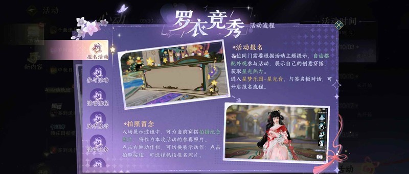 罗衣竞秀每期共有四场活动,活动开始时间为每周五晚上九点,在星梦乐园—星光台—签名板(493 586)报名参加活动。