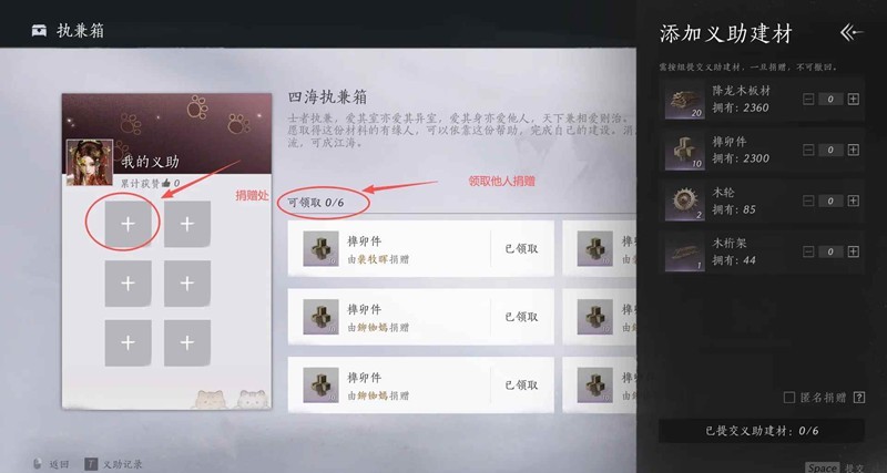 ③执兼箱为共享材料的地方,点+号捐赠材料,每周可领取他人捐赠材料6次