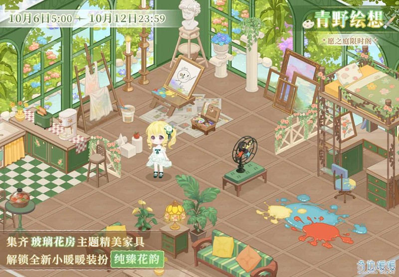 10月6日—10月12日,在小屋愿之庭的限时抽奖阁“青野绘想”许愿,可获得玻璃花房主题家具!活动期间,每2天可免费“许愿一次”,并半价“许愿五次”一次