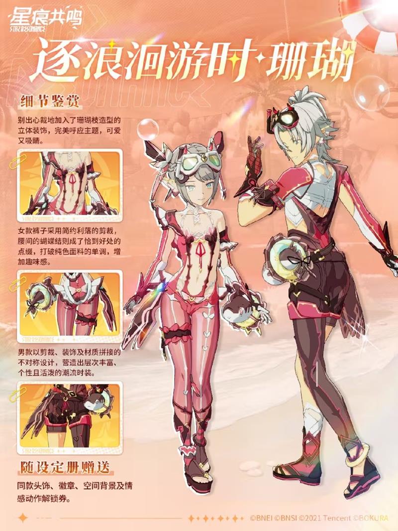 在这个阳光明媚的日子里,我们非常高兴地宣布,星痕共鸣系列的最新力作——「逐浪洄游时·珊瑚」泳衣套装,今日正式惊喜上线!这是一封来自大海的邀请函,邀请您穿上这身珊瑚泳衣,带上好心情,去和蔚蓝的海浪扑个满怀吧!