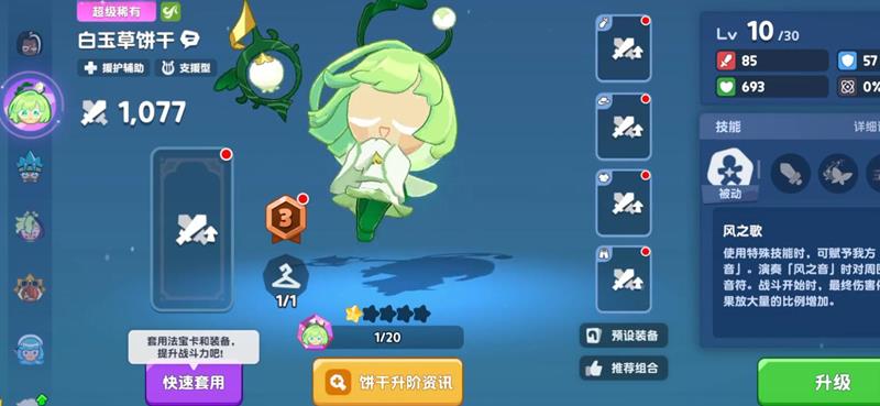 白玉草饼干的核心被动技能为风之歌,每次使用特殊技能时会为我方单位附加风之音状态,当该状态叠加到一定层数后会自动触发音符攻击,对敌人造成伤害。战斗开始时,最终伤害会根据队伍中增益效果的数量提升,这意味着白玉草自身携带的增益技能越多,团队开局输出就越强。这一机制让白玉草在面对高频率技能释放的阵容时发挥更佳,尤其适合搭配技能循环快的输出型饼干。