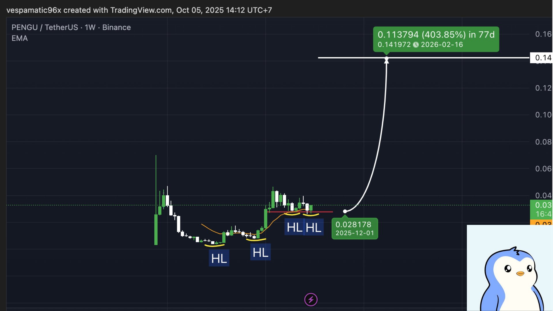 基于新动能,多位专家预测该迷因币将突破新高。加密专家Vespamatic指出一个近乎相同的分形结构——今年早些时候该结构曾预示两次重大PENGU上涨行情。"我们正处于吸筹阶段",他写道,并补充历史分形暗示新一轮拉升可能即将到来。