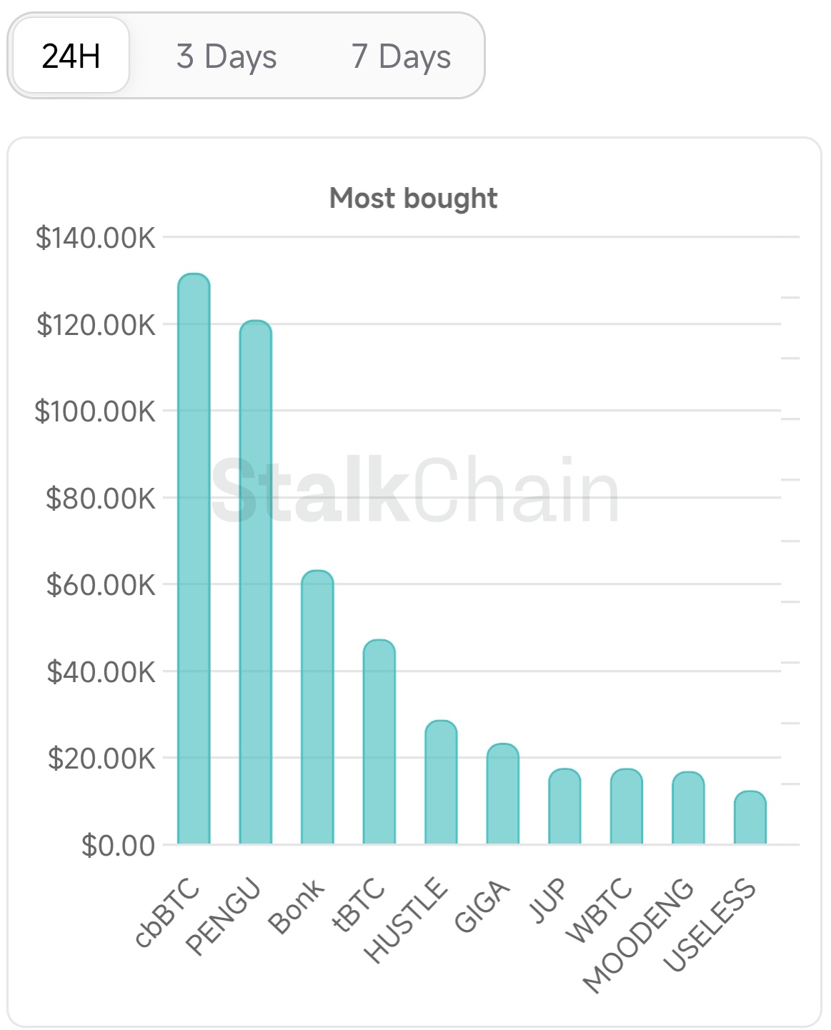 链上追踪器显示PENGU主导Solana迷因币购买。Stalkchain报告称其是过去24小时"聪明钱"买入最多的迷因币。