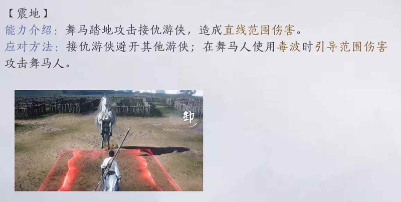 马从迷宫回到场中后,第二次连续震地与第三次连续震地中途读条毒波,【随机点名一人】,将直线AOE引导至舞马人所在标点。