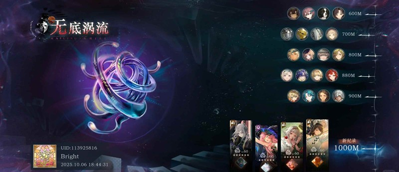 800-900m:启示队(无阿莱夫)+艾吉奥“美丽新世界”特殊打法(战锤+五指剑)。注意在没有气泡的时候不要让同一角色连续攻击,否则会被眩晕。我的启示队缺少阿莱夫,所以整体练度较高,成员共鸣在12-13。离别变奏曲和春日轻步至满增幅。打到了880m;对于剩下20m,我专门去某站学习了一个特殊打法,想了解的可以自己去搜。虽然我的美丽新世界是0增幅,但是打掉Boss的2管血绰绰有余。