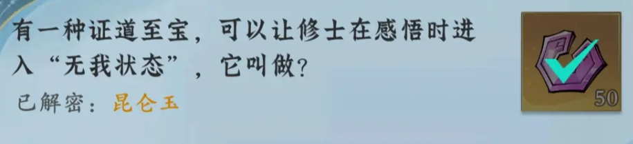 3、有一种证道至宝,可以让修士在感悟时进入"无我状态",它叫做?昆仑玉
