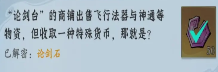 7、"论剑台"的商铺出售飞行法器与神通等物资,但收取一种特殊货币,那就是?论剑石