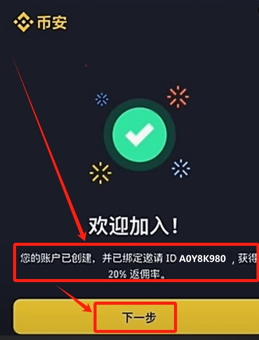 可以看到我们已经成功注册了币安账户,同时下方提醒获得了20%的返佣率,也就是永久的20%手续费减免。我们点击【下一步】。