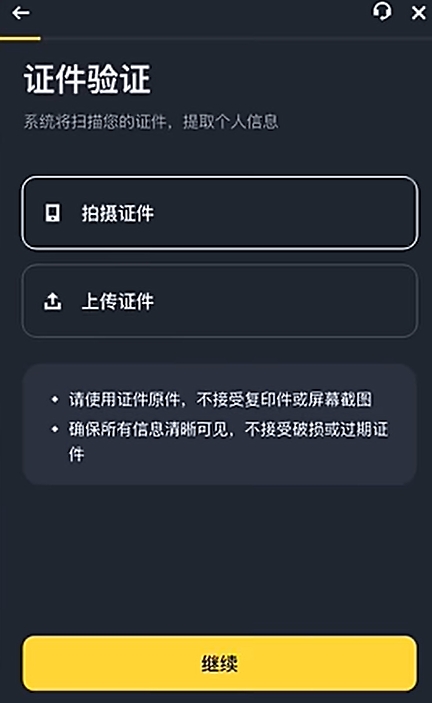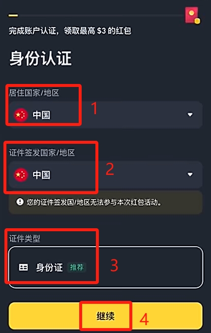 居住国家和地区我们选择“中国”,证件签发国家我们同样选择“中国”,证件类型选择“身份证”,点击【继续】。