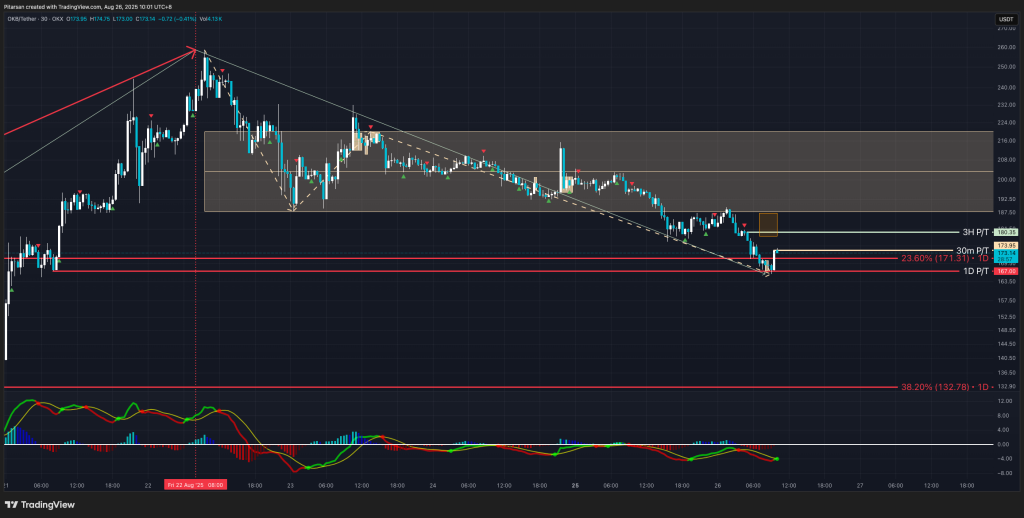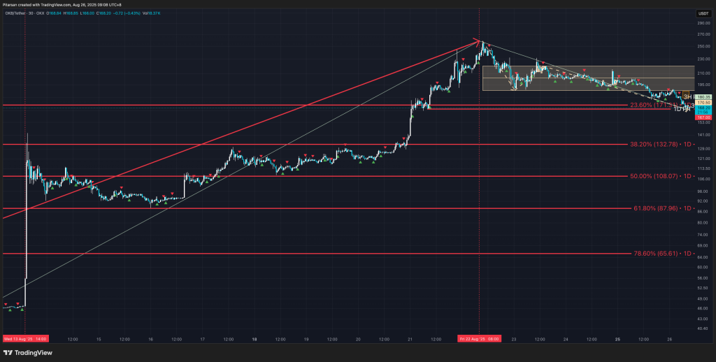 在冲高之后,OKB回落至 170–200 美元区间。表面看似压力很大,但结合大盘走势却不难理解:比特币在 11.3 万美元附近震荡,以太坊徘徊在 4700 美元,整体市场都在消化前期涨幅。