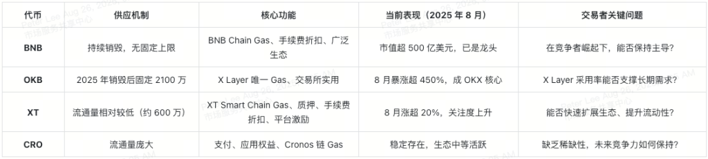 平台币对比:BNB、OKB、XT 与 CRO 的正面对决