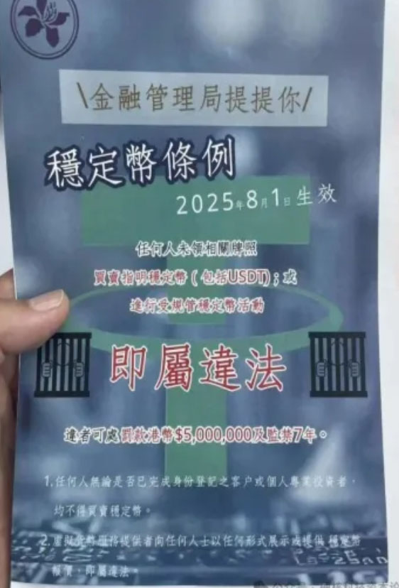 今年我国香港地区最具影响力的《稳定币条例》已发布,并于2025年8月1日生效,这本来是进一步规范加密资产行业、金融市场的大好事,但飒姐团队才注意到,随着生效日的来临,香港加密资产市场出现了一个非常莫名其妙的传单事件,一时之间搞得人心惶惶。
