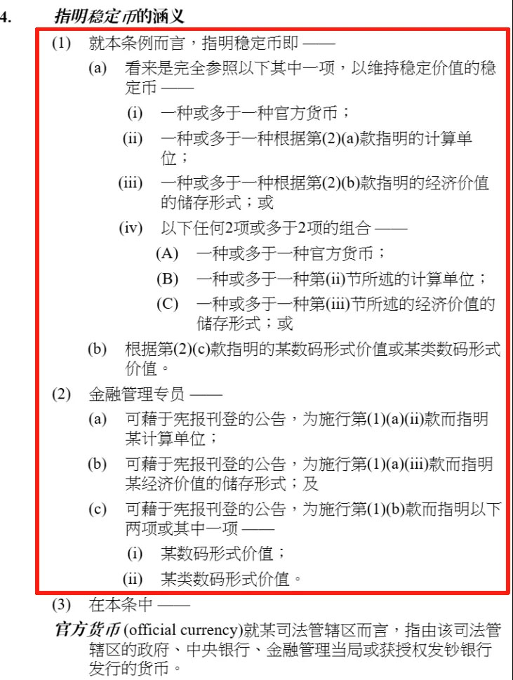 第4条规定的“指明稳定币”这个概念就有点绕了,伙伴们可以简单的理解为香港《稳定币条例》为规管相关业务而独创的一种法律上的“狭义的稳定币概念”。具体原文如下: