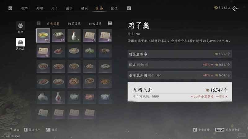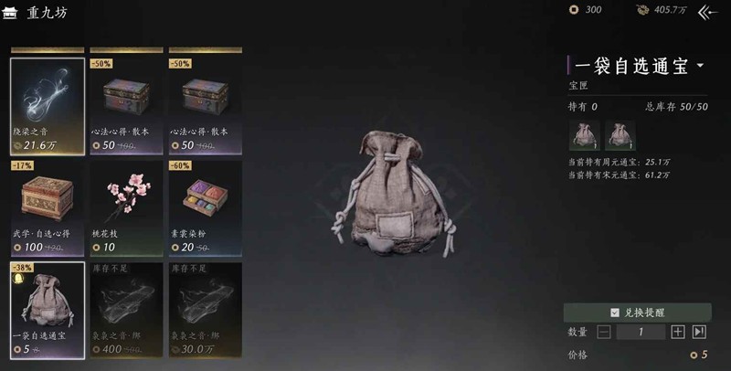3、除去2中的3种货币,我们还有可以无上限兑换宋元的宝钱,体力可以通过烹饪、制药等获得食物药品,然后在商店-交易-消耗品中卖给各个百业获得宝钱