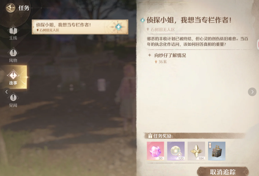 无限暖暖1.10丰收季中隐藏逸事任务为侦探小姐,我想当专栏作者!打完伊始之地的呼唤才会解锁,将所有的主线间章都过完后即可触发,任务为永久任务,后续可随时进行。来到木桶小居找到斯嘉丽并对话即可接取到任务!